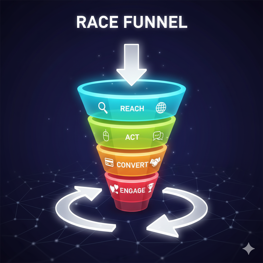 Our funnels are built on the proven RACE© (Reach, Act, Convert, Engage) framework, integrated directly into your CRM for a transparent pipeline.